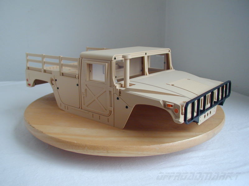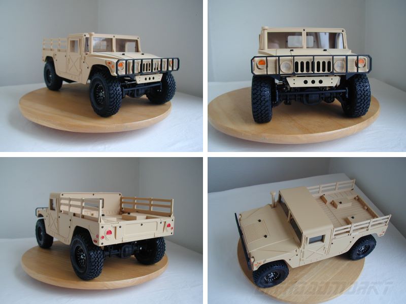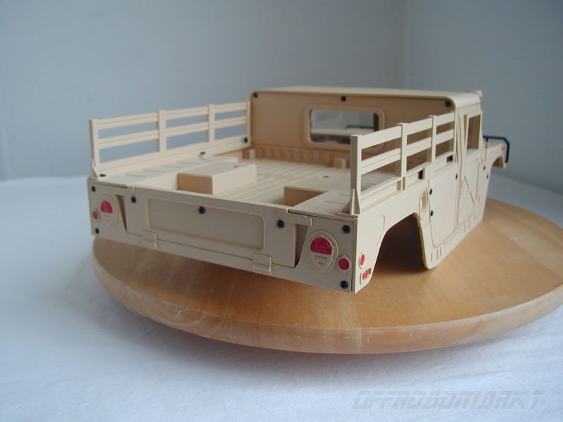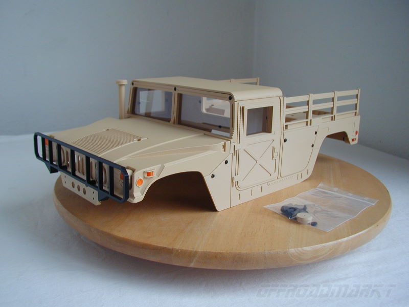 Für Einsatz als Crawler, Scaler usw. Durch das Tamiya CC-02 Chassis kann der Hummer seine Geländegängigkeit voll ausleben. CC-02 Bauteile E7 und E8 sind nicht nötig und sind zu entfernen. Für Stossdämpfer wird eine Vorspannscheibe 2mm hinten empfohlen.