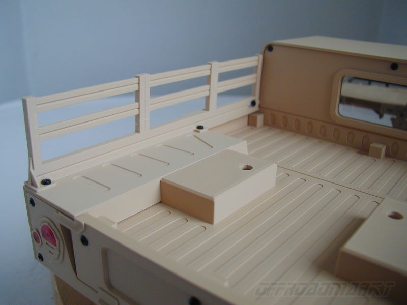 Für Tamiya Spiegel sind Bohrungen bereits angedeutet. Durch die Rahmenbauweise der Fenster kann auch getönte Folie zusatzlich angebracht werden. Chassis, Elektronik, Rückspiegel sind nicht enthalten.
