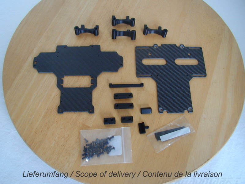 Inkl. Montageanleitung und benötigte Schrauben und Halterungen. Vom Original Chassis sind die vier Front / Heck Verbindungsschrauben mit Muttern, Servohalter sowie die Akku Klammer zu verwenden. Passend für Akkus max. 138,5 x 47,5 x 25,5 (mm L x B x H)